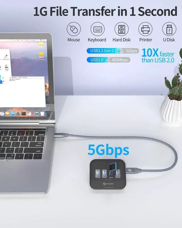 USB 3.2 Gen 1 - USB Splitter 4 Ports supports super faster data transfer up to 5Gbps, 10X faster than USB 2.0, which allows you to transfer HD movies or large files in seconds. The great choice for game player and video workers.