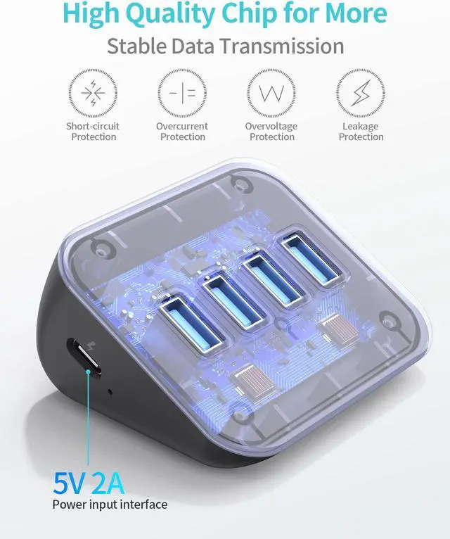Safe, Stable & Anti-interference - Built-in industrial grade chip avoids overcurrent, overvoltage, short circuit and high temperature. Excellent effect on EMI, ESD, 2.4G and WIFI anti-interference shielding. With a 5V2A USB-C power input interface to ensure stable data transmission (The power adapter is not included, this is a data hub not recommended for charging).