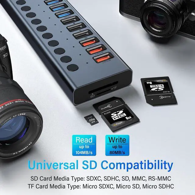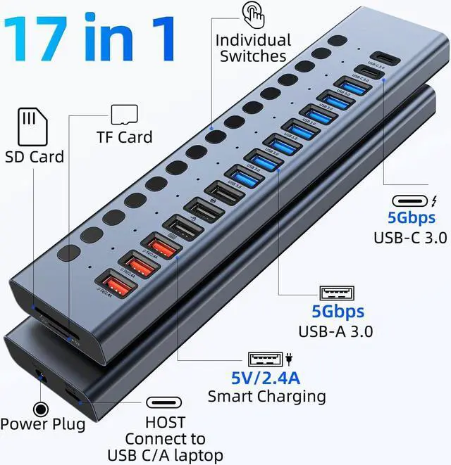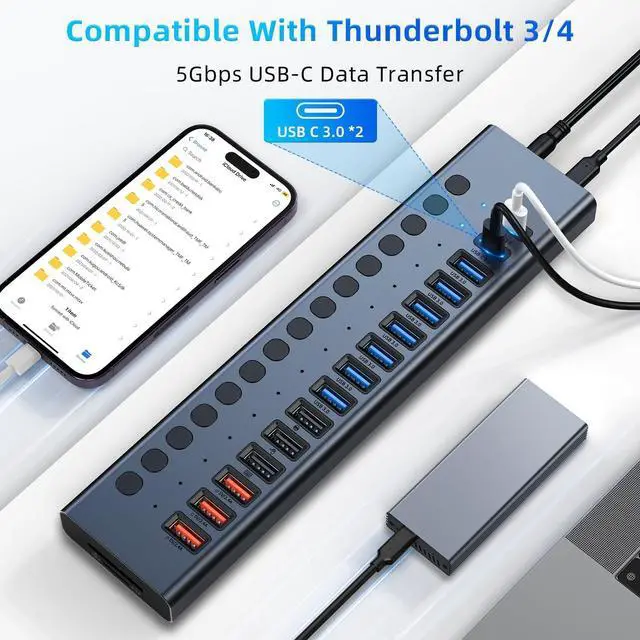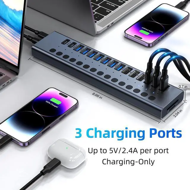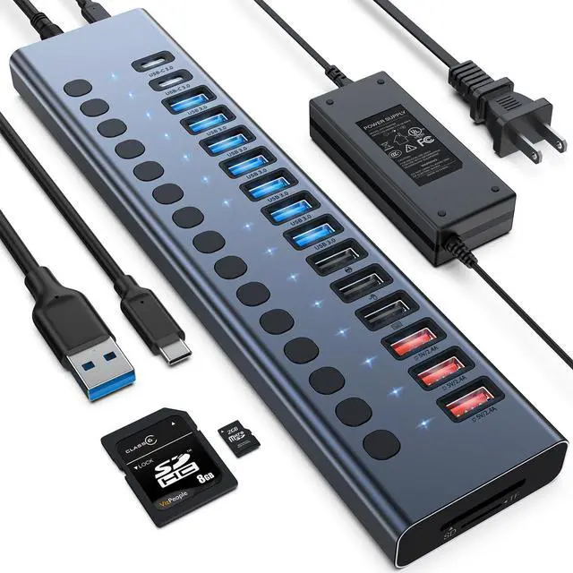 Powered USB Hub: VANGREE Powered USB Hub equips with 7 x USB 3.0 ports, 3 x USB-A smart charging ports, 3 x USB 2.0 ports, 2 x USB-C 3.0 ports, SD/TF card reader. The USB charging-only ports provide 5V/ 2.4A power to charge your phone, tablet and so on. Thunderbolt 3/4 Compatible.