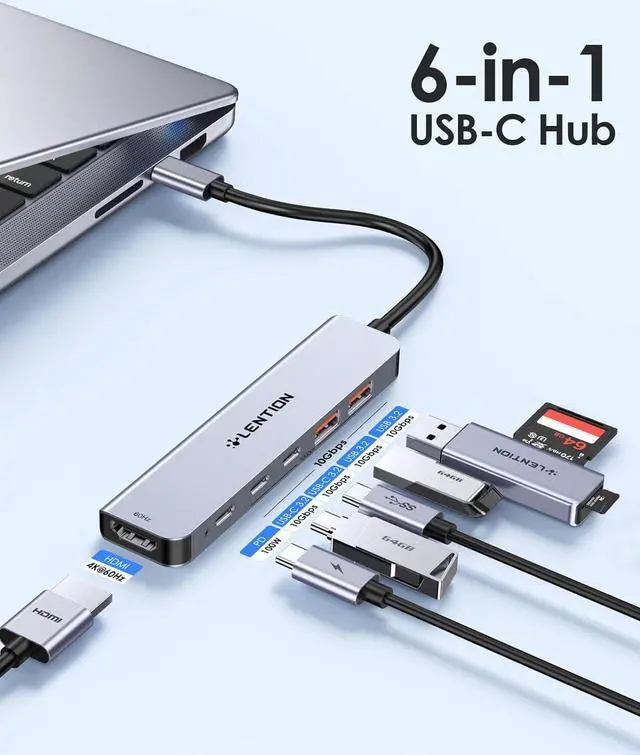 6-in-1 Expansion - LENTION USB C Hub features with 2 USB A 3.2 Gen2 ports, 2 USBC 3.2 Gen2 ports, a 4K@60Hz HDMI port, as well as a 100W Type C Power Delivery charging port.