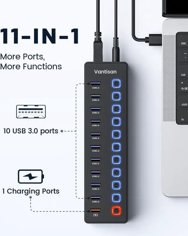 11-port hub distributor, multi-port expansionusb hub for laptop can expand a single Usb port to 10 Usb 3.0 ports and 1 Usb smart charging port, and is equipped with a 100 cm ( 3.3 ft) long Usb cable and power adapter, and the power cord is 120 cm (4 ft) long. Usb hub is an ideal data backup and transmission solution for home and office