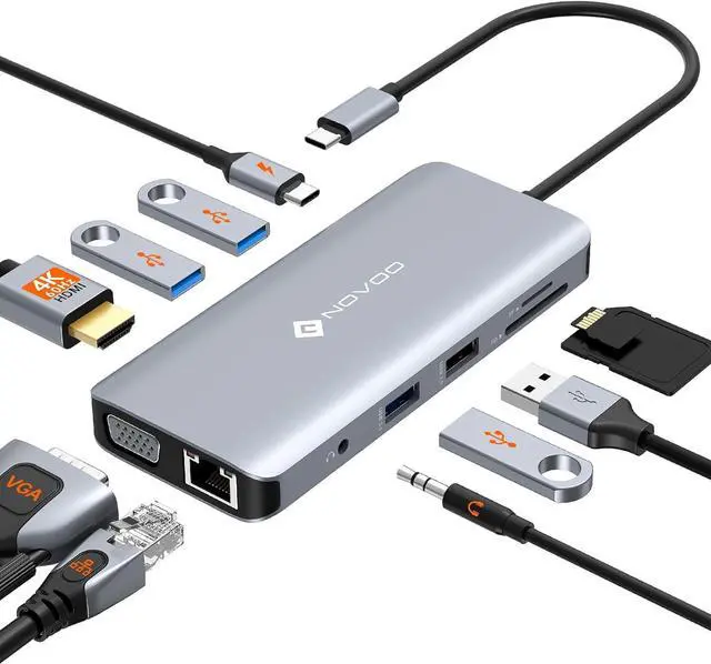 USB C Hub Multiport Adapter - Compatible with macbook pro usb adapter, work for MacBook Pro or USB-C devices. The multiport USB-C hub featuring a RJ45 Gigabit Ethernet, a 100W PD Charging Port, a 4K premium HDMI port, a SD/TF card reader, 3.5 mm Audio jack and a VGA port and 3 USB 3.0 Ports, 1 USB 2.0 allowing you to connect a keyboard, mouse, USB driver, external Disk for MacBook Pro
