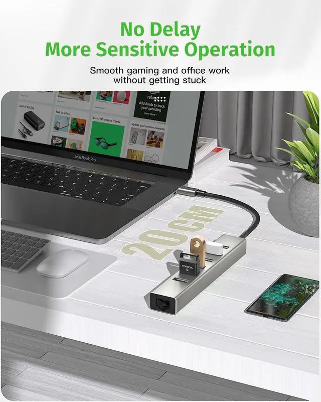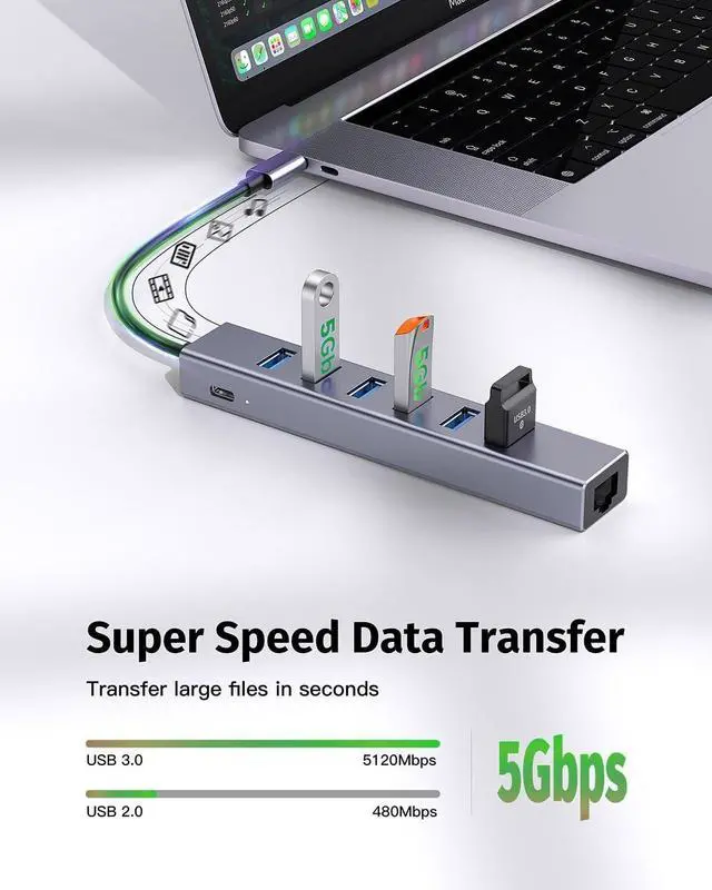 SuperSpeed TransmissionWith high efficient USB 3.0, Getatek 8-in-1 USB C splitter provides 5 Gbps stable data transfer and is compatible with 2.0 / 1.0. It is fast enough to transfer an HD movie in seconds.