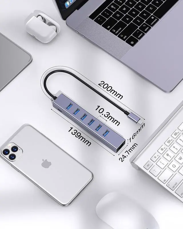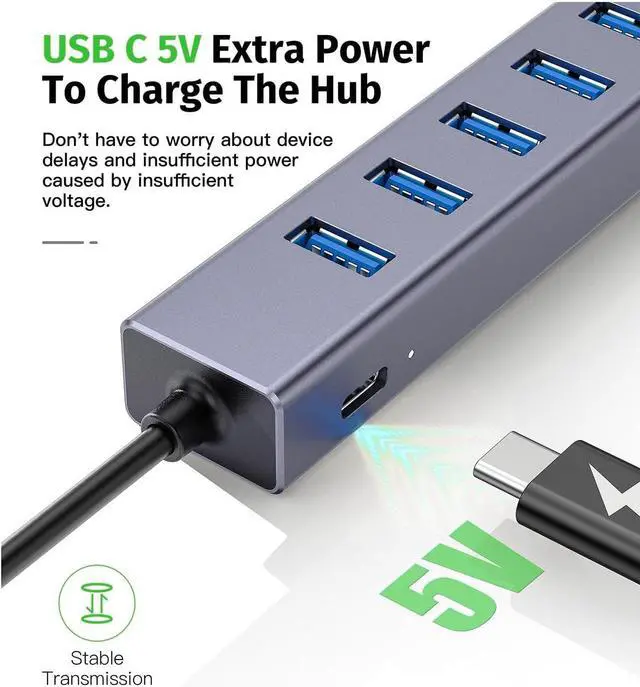 5V USB C Power Adapter The Powered USB Hub has equipped with a 5V power adapter that ensures safe & steady data transfer for all connected devices. USB hub 3.0 Splitter made of high-quality aluminum alloy and ABS design, Sturdy and durable, compact and not easy to move that fits naturally for home and workplaces.