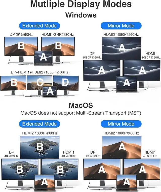 Triple Display Docking Station: The hp docking station for laptop can easily to achieve dual monitor and 3 monitors displays for Windows, using different screen to do different projects will make your work/life more efficient. HDMI 1 max up to 4K@60Hz, DP/HDMI 2 up to 4K@30Hz(work separately while source is DP 1.4 ). When connect 2 displays, resolution max up 4K@30Hz+2K@60Hz(DP 1.4 source). Display output will be 1080P when triple displays. Note!!! Mac OS ONLY support SST Mode(AAA, ABB)