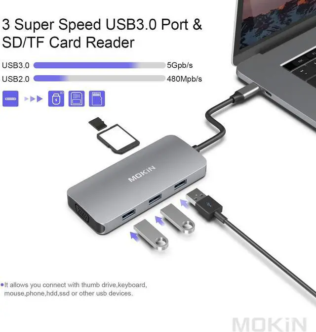 USB-C Hub (8-in-1): Extend one 4K UHD HDMI port, 3 supper speed USB 3.0 ports, one SD menmory card slot and one TF momory card slot, VGA slort, USB-C Power Pass-through Slot from one USB-C/thunderbolt 3/ type c port