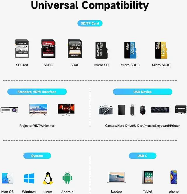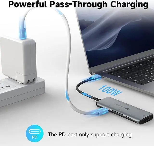100W Power Delivery & SD TF Cards: The type c/thunderbolt hub supports a 100W USB C pass-through charging, and provides extra power for HDD, DVD, ideal for MacBook Pro/Air and other USB C devices. Built-in SD and TF slots for easy access to files from universal SD and Micro SD Memory Card; Supports 2 cards reading simultaneously