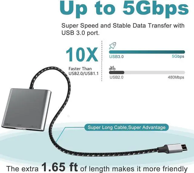 High Speed Transfer The usb type c 3.1 hub supports high speed data transfer up to 5Gbps (5120Mbps), 10x faster than USB 2.0 (480 Mbps). Compatible for USB flash disk, camera, removable hard drive, mouse, keyboard or other USB A 2.0 /USB A 3.0 devices