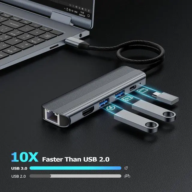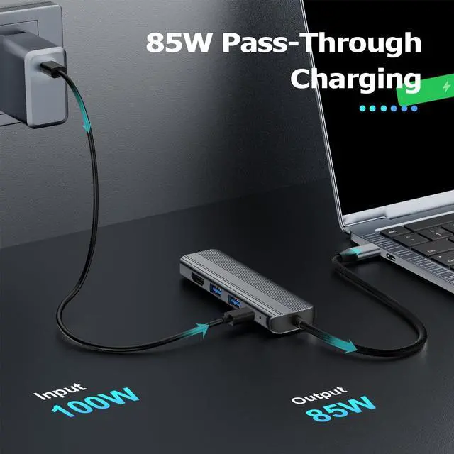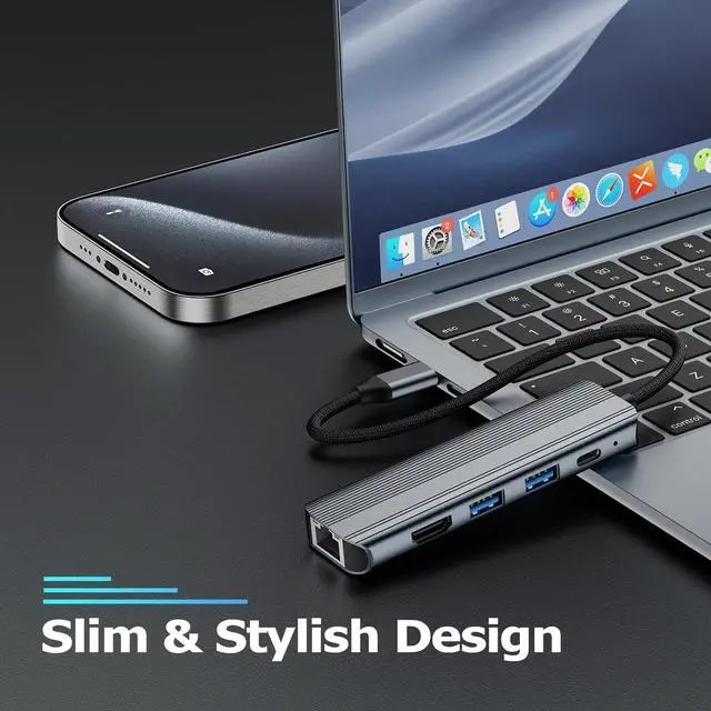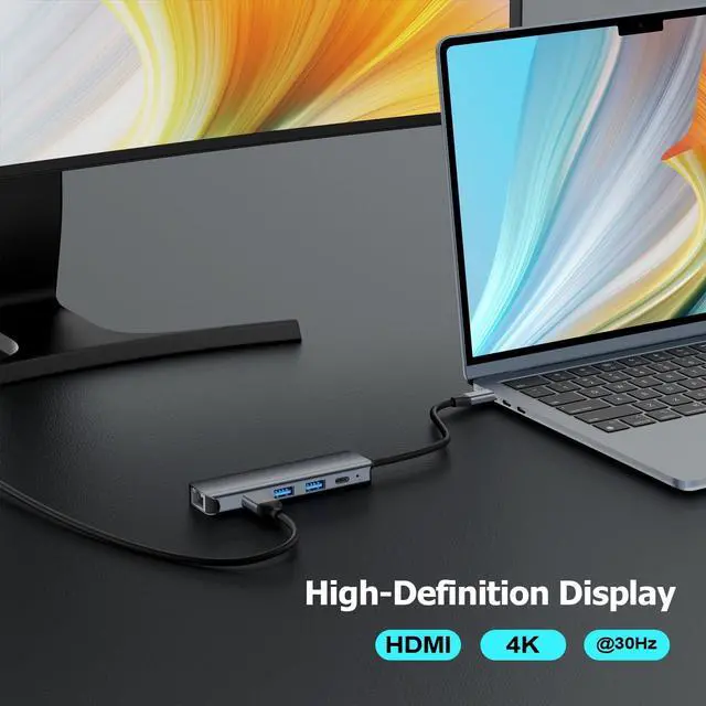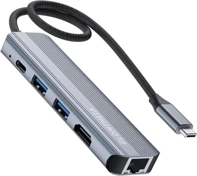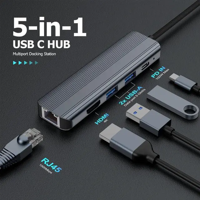 5-in-1 Multifunction HubInstantly expand your USB-C port into 5 versatile ports including a 4K HDMI port, 2 USB 3.0 ports, a USB-C PD charging port, and a Gigabit Ethernet port. Perfect for enhancing your laptops connectivity and productivity.