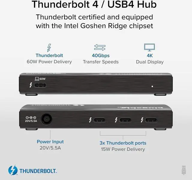 Certified Reliability: The Plugable Thunderbolt 4 and USB4 Hub with 60W Charging is Thunderbolt certified and built on the Intel Goshen Ridge Chipset for maximum USB-C, USB4, Thunderbolt 3, and Thunderbolt 4 dock functionality