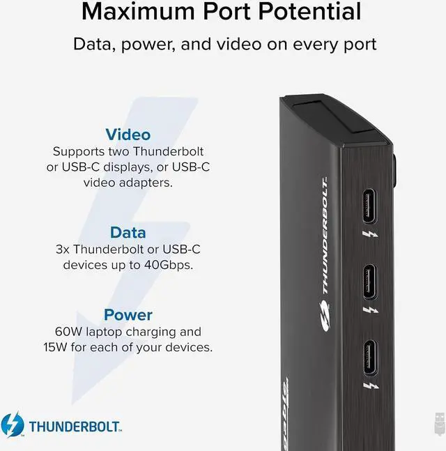 Thunderbolt 4 and USB4: Every downstream port on this Thunderbolt hub functions as a Thunderbolt 4, USB4, Thunderbolt 3, or USB-C port supporting up to two 4K displays, 40Gbps of data bandwidth, and up to 15W power. One USB-C to HDMI video adapter included