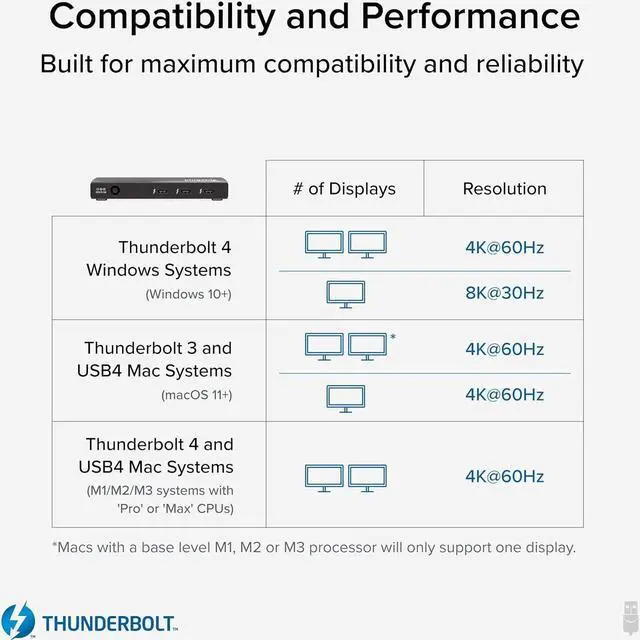 Compatibility: Windows (10+) and macOS (11+) Thunderbolt 4 and USB4 systems and Thunderbolt-enabled iPad Pro models. Thunderbolt 4 systems support 2x 4K screens at 60Hz or 1x 8K screen at 30Hz; 1x 6K on base Apple Silicon Macs and Thunderbolt iPad Pros. Functionality limited on USB-C only systems. Thunderbolt 3 Windows systems not recommended