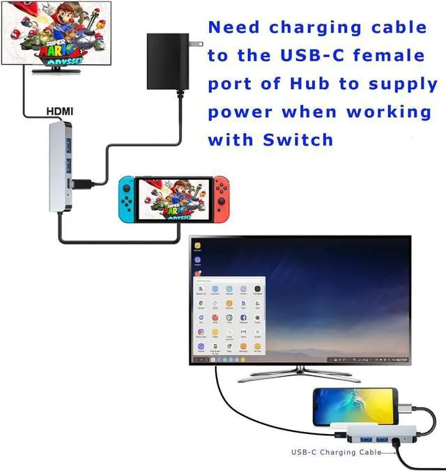 NOTE: Need supply power with switch charging cable to Hub when working with Switch/OLED. Not support Swtich Lite.