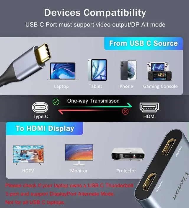 (Note: NOT for all USB-C port laptop, before you purchase, please confirm your usb c laptop supports Thunderbolt 3/4 video output or DisplayPort Alt Mode). This usb c to dual hdmi adapter compatible with MacBook/MacBook Pro2021 2020 2019 2018 2017, MacBook Air2020-2018, iPad Pro 2018, Dell XPS13/15, Samsung Galaxy S9/S9+, and more USB C laptops/Tablets/Phone, also, it supports Steam Deck, Rog Alloy to connect with monitors for exciting gaming.