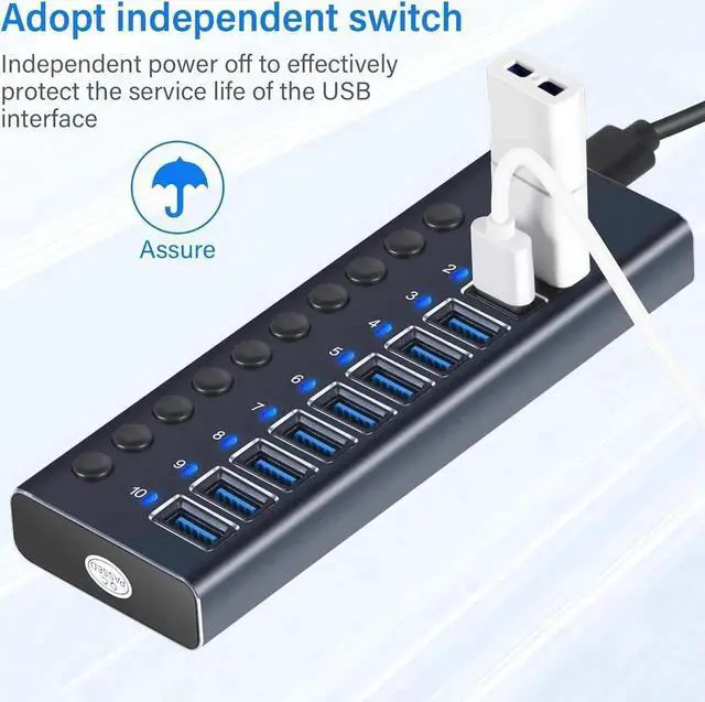 Fast Data Transfer: USB 3.0 hub 10 port powered expansion delivers data speeds of up to 5 Gbps, 10x faster than USB 2.0, allowing you to transfer HD movies and photos, videos and music in seconds, without drivers. Powered USB Hub made of high-quality aluminum alloy, Plug and play, no drivers are required, fit for office, home and school.