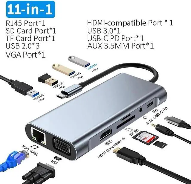 11-Ports USB C Hub, USB Hub to Multiport USB C Dongle Adapter 11 in 1 with 4K HDMI, VGA, RJ45, USB 3.0, 3*USB 2.0 Ports, 100W USB-C PD, 3.5mm Aux Ports, TF/SD for MacBook Pro and More Devices
