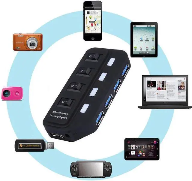 This USB 3.0 hub adds 4 USB 3.0 High-speed ports, includes 4 individual power switches and blue status LEDs, You can turn off the corresponding button if you don't use it.