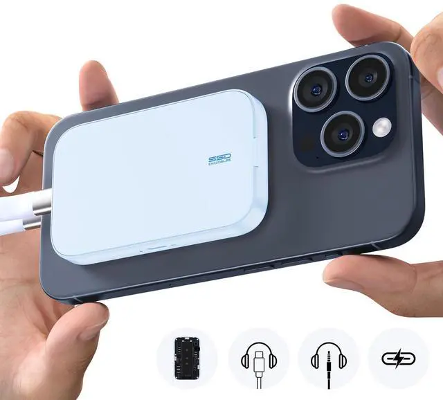 (3) MULTI-PORT FOR MORE CHOICE: The iPhone 15 pro max prores SSD enclosure is designed with a USB-C PD 3.0 port (max 60W) for fast charging your phone, a USB-C 2.0 480Mbps & Audio/Mic for earphone/ micphone with USB-C port, a 3.5 mm Audio & Mic jack for earphone/ headset with 3.5 mm port, and a USB 3.2 Type C M. 2 SSD enclosure to support data transmission speed up to 10Gbps. *Note: Use the both Audio/Mic ports at the same time, only pick the first one.