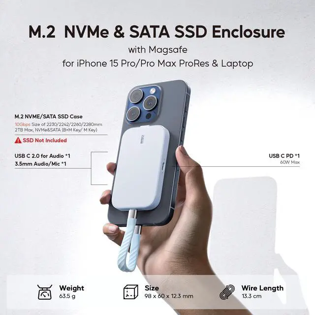 (2) MAGNETIC SUCTION & DIRECT STORAGE OF PRORES VIDEO: Built in magnetic suction, can be firmly absorbed on your phone and not easy to fall off. Paired with a Magsafe phone case, phone with normal phone case, or phone without case. The M. 2 2230 nvme ssd enclosure supports direct external storage of 4K@60Hz ProRes videos by iPhone 15 Pro/Pro Max.