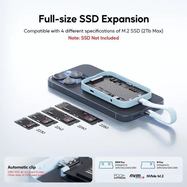 Fit with 2230/2242/2260/2280 SSDs. Laptops: full size available. Phones: Please use the M.2 SSDs of size 2230 for iPhones, because the SSDs of size 2260 2280 require more current to work. Phone can't provide enough current that may easily cause insufficient power and unstable current, which leads to "keeps disconnecting from phone" issues. If you would like to use the 2260/2280 SSDs, please connect with the PD power to keep enough current for SSD normal working |