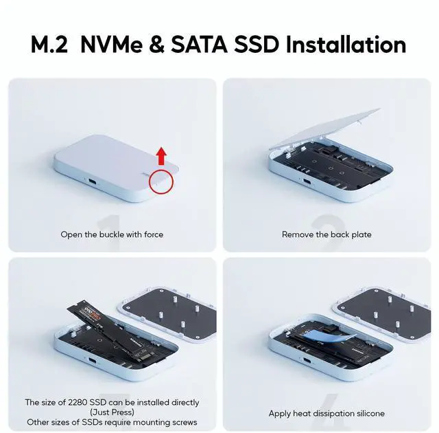 SATA / PCIe3.0 NVMe / NGFF M.2 SSD, please NOTE: The SSD enclosure DOESN'T support SSDs with a heatsink (the heatsink SSD is too thick that can't close back cover) |