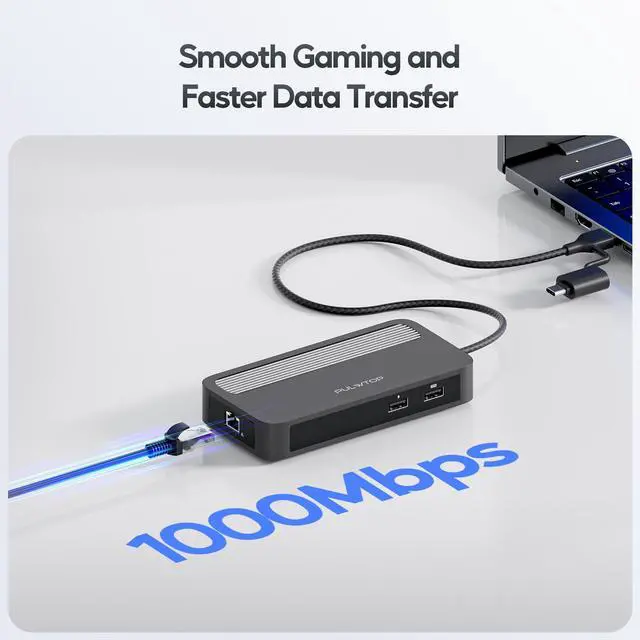 Muilt-Extended Modes for macOS/Win: Boost your work efficiency with the PULWTOP USB C Docking Station's DisplayLink Technology to extend dual 4K@60Hz monitors for macOS and Windows systems. Choose between extended or mirrored display modes effortlessly. (Please install the Displaylink Driver before use)