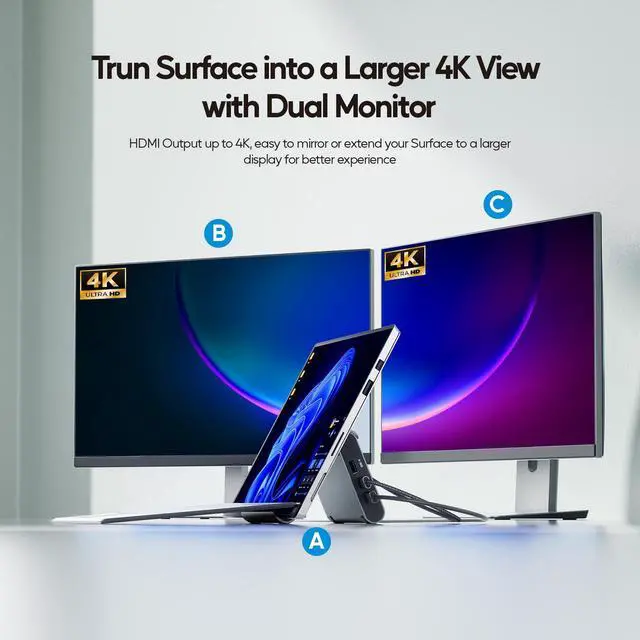 Docking Station: This docking station stand for Microsoft Surface Pro is compatible with Surface Pro 11/10/9/8/, and other Windows laptop (with full-featured usb c port or thunderbolt 3/4) comes with 2 x 4K@60Hz HDMI for HD video output, 1 *USB A 10Gbps, 2 *USB C 10Gbps, 2 *USB A 5Gbps, RJ45 wired Gigabit Ethernet.