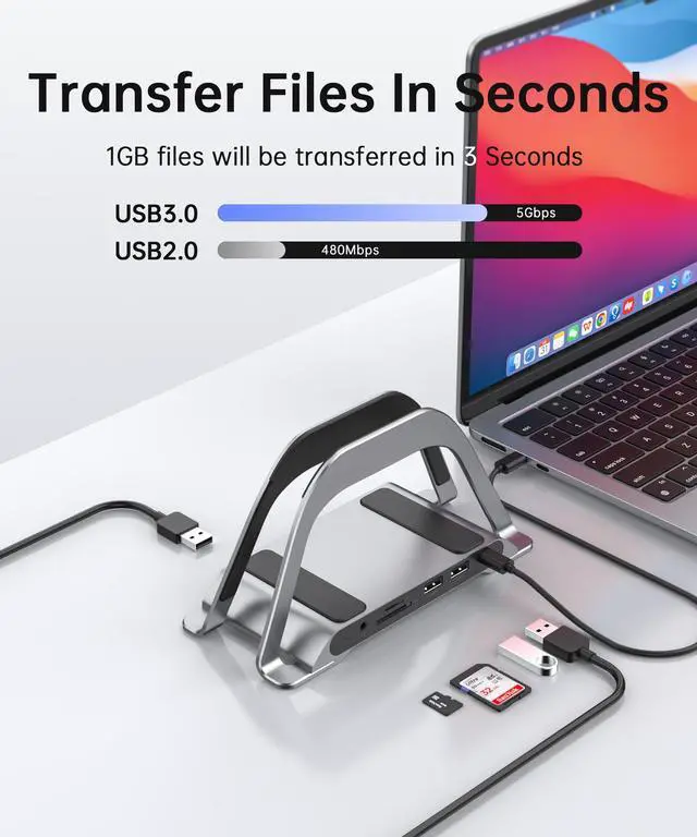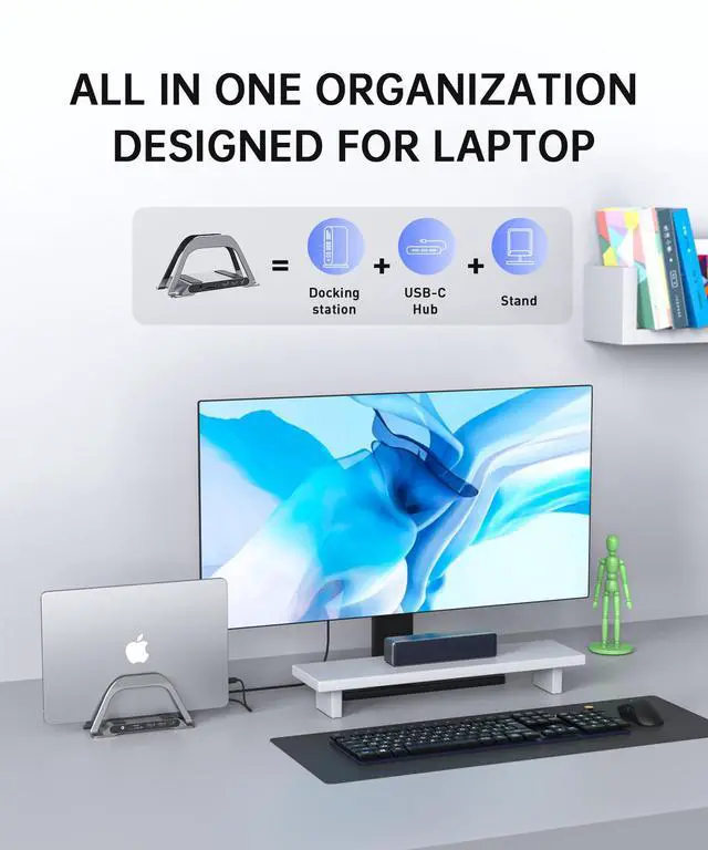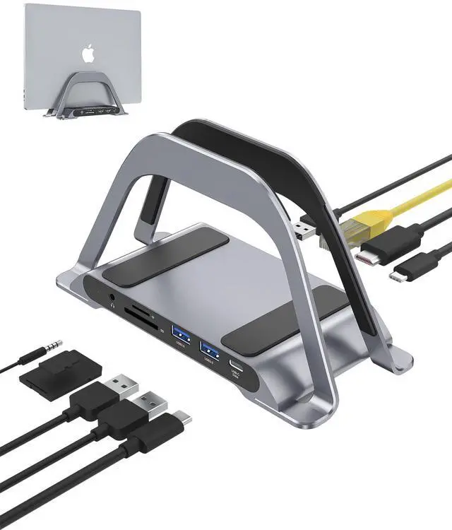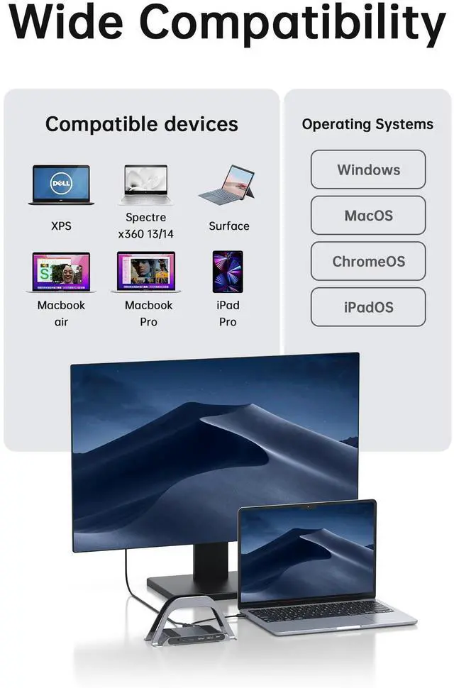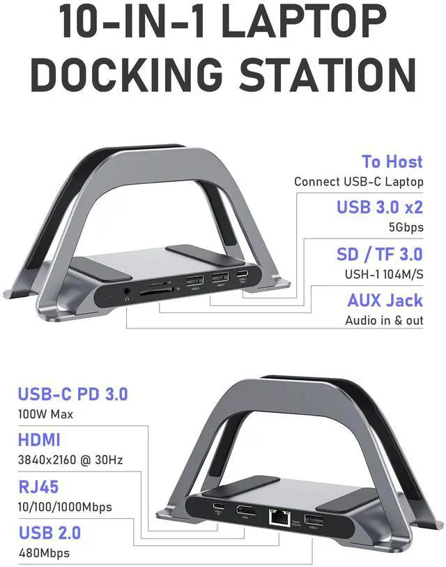 (2) 2 in 1 Docking Station with StandThis Docking Station not only can meet the various needs of users, but also meet the laptop stand function (improve desktop utilization). The demolished bracket is enough to act as a laptop bracket to help increase space, create more working space, and increase productivity.
