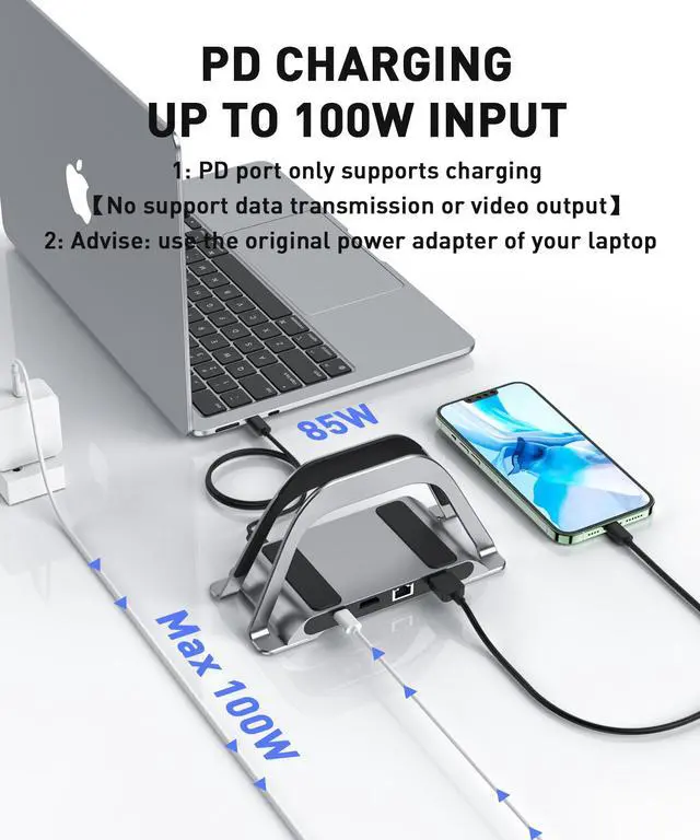 NOTE: Please use original power adapter of your laptop to connect by the USB-C PD input port and through the usb-c data output port to connect your laptop.