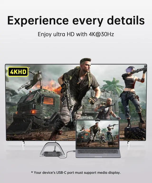 (3) 4K HDMI HD Output: USB C hub HDMI port output up to 4K@30Hz or Full HD 3840X2160 30Hz resolution, it can perfectly mirror or extend your screen to HDTV, monitor or projector, suitable for full HD movies, 3D video Games, office meetings and entertainment. Surf the web, watch video clips, transfer data, all in one. Bringing you vivid video synchronization. (Note that this product only has one HDMI port, so only one external monitor is supported)
