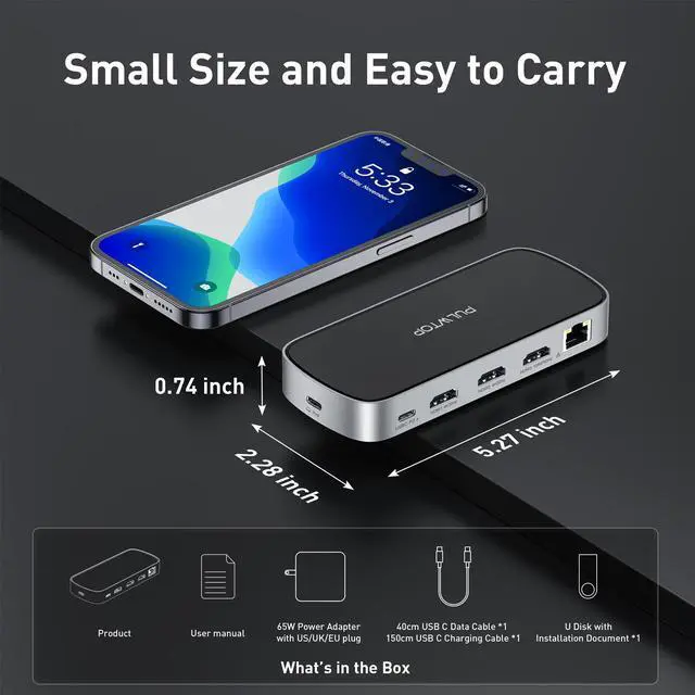 (4) 10G High-Speed Data Transmission: PULWTOP USB-C docking station has a 10Gbps usb-c port and a 10Gusb-A port, which can transfer videos, pictures or large files in seconds. The docking station also have two 2.0 USB-A ports to provide the most stable connection for your mouse and keyboard.