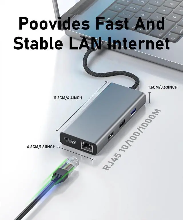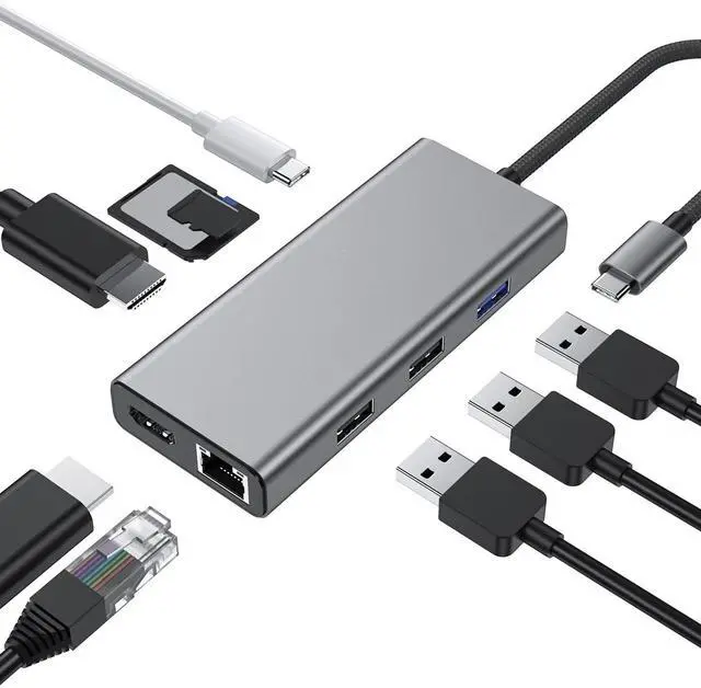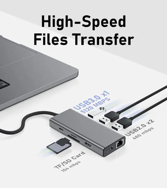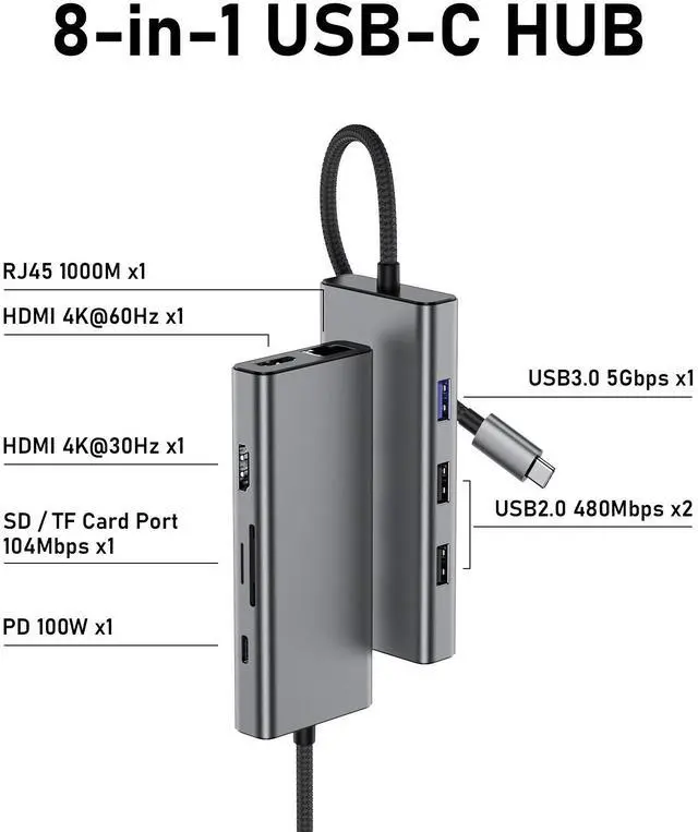 (2) 9 in 1 USB C Docking Station: A collection of 9 most commonly used functional ports in life, this laptop docking station can extend your laptop to 10 ports through type c/thunderbolt 3 port, you will get 2*HDMI 4K60Hz, 1*5Gbps USB 3.2 port, 2*USB 2.0 port, 100W PD Charger port, SD/TF card reader, Gigabit Ethernet port, easy Meet your daily needs. USB C to dual HDMI Adapter is widely compatible with Dell/MacBOOK/Pro/Air/etc laptop.