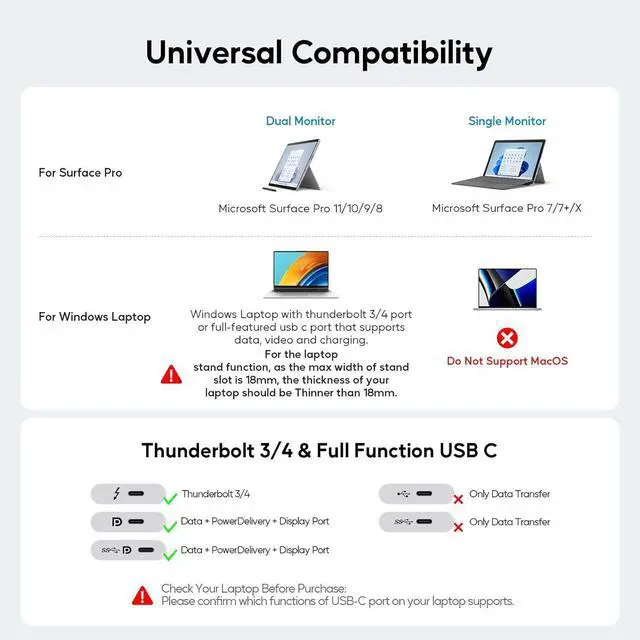 11 in 1 Docking Station: This microsoft surface docking station and Windows Laptop is compatible with Surface Pro 11/10/9/8/, and other Windows laptop (with full-featured usb c port or thunderbolt 3/4) comes with 2 x 4K@60Hz HDMI for HD video output, 1 *USB A 10Gbps, 2 *USB C 10Gbps, 2 *USB A 5Gbps, RJ45 wired Gigabit Ethernet. NOTE: Do not compatible with Macbook/Mac OS Laptop.