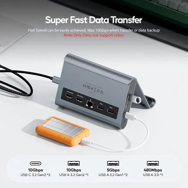 Super Speed Data Transfer Dock: This surface docking station has 2 USB C 10Gbps port (not support video and charging) , 1 *USB A 10Gbps 5Gbps and 2 *USB A 5Gbps to transfer files. The USB A 2.0 Port allows you to connect mouse/keyboard without lag. It improves your work efficiency. With PD 100W Charge Port and RJ45 Wired Gigabit Ethernet (10/100/1000Mbps).