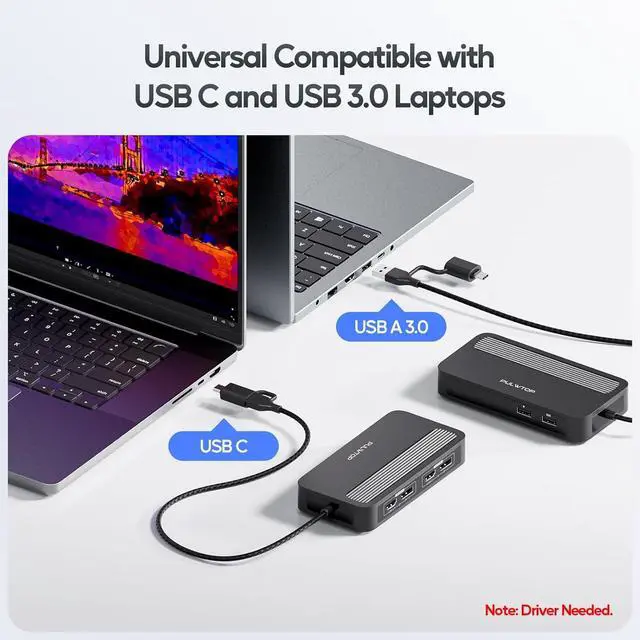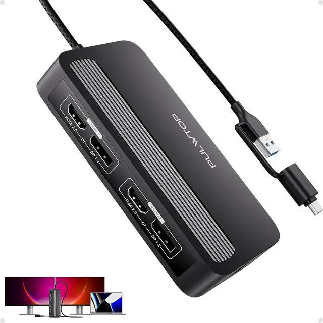 2-in-1 Connector:The Dual monitor adapter Equipped with a versatile 2-in-1 connector that effortlessly adapters to both USB-C and USB-A devices for maximum compatibility.