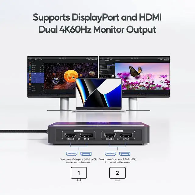 7-in-1 Expansion:Simplify your connectivity with the 7-in-1 Dual Monitor Docking Station. It features 2x HDMI 4K@60Hz, 2x DP 4K@60Hz, 2x USB A 2.0, 1x Gigabit Ethernet, catering to almost all your daily work needs. Please note: This dock does not support charging for your laptop.