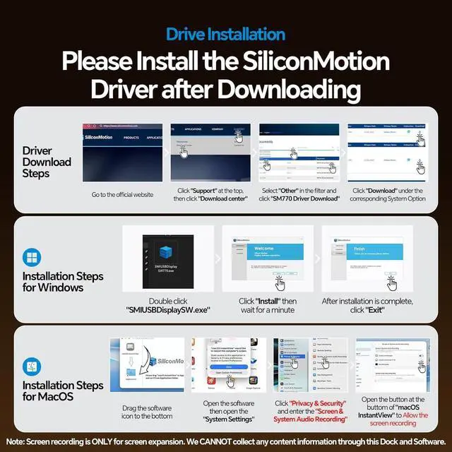 Triple 4K Extended Display - The Macbook Docking Station Stand features 3 x HDMI and 2 x DisplayPort 4K displays, allowing you to enjoy various display combinations (HDMI, DP, or a mix - when 5 video ports are connected, 2 monitors will not display.) to effortlessly extend your laptop to triple 4K@60Hz monitors with unparalleled visual experience. NOTE: You MUST install the Latest Silicon Motion Driver (SM770) firstly and then permit " Screen Recording " in System Settings > Privacy & Security