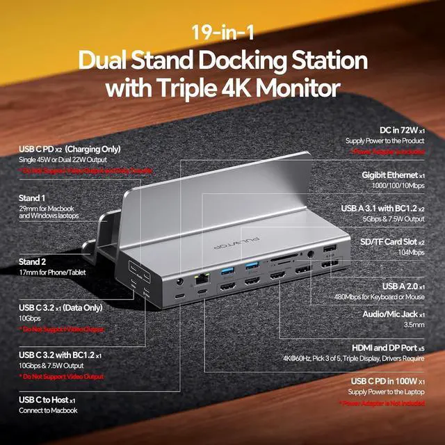Enrich Your Setup with 19 Ports Laptop Docking Station - The USB C Docking Station triple monitor is equiped with 3 HDMI & 2 DisplayPort, USB-C 10Gbps data ONLY, USB-C 10Gbps with 7.5W, 2 USB-A 5Gbps with 7.5W, USB-A 2.0, SD/TF, Ethernet, 3.5mm audio, 2 USB-C PD output charging, PD IN and USB-C to Host, DC input ports, easy to empower your various connectivity needs with just one USB-C cable. NOTE: When use the dock with USB-A laptop, the PD-IN port will not work, meaning that the dock will not charge your laptop, 3)This dock MUST be powered with the included 72W DC power adapter to make it work