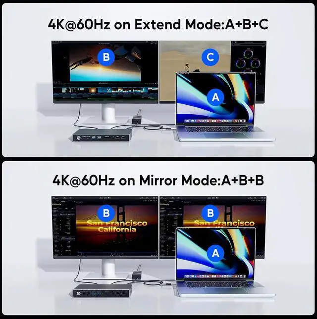4K 60Hz Dual Display Extension: After installing the DisplayLink driver, it could help to achieve dual monitor display. DP or HDMI(Display 1)+DP or HDMI(Display 2) that all displays could reach 2*4K@60Hz under DP 1.2 Mirror mode and extend mode for Macbook could be used based on your needs flexibly. (Support both SST & MST) NOTE: HDMI and DP ports of the display 1 and display 2 port could only choose one of the two to use