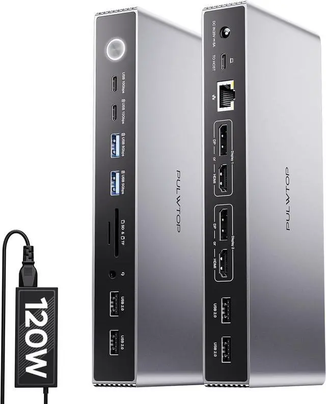 Extensive Connectivity: The DisplayLink docking station includes 2*4K@60Hz HDMI, 2*4K@60Hz displayport, 2* 5Gbps USBA 3.2 Gen1 port for data transfer and 7.5W charing, 2* USB C 10 Gbps 3.2 Gen2 port (one of the two USB C port supports 15W charging for other devices, 85W USB-C PD(Max), 4*USBA 2.0 ports, Gigabit Ethernet, 3.5 mm audio/Mic jack. NOTE: The PULWTOP USB C docking station should be connected with 24V 5A (120W) included DC in power adapter, or it will not work