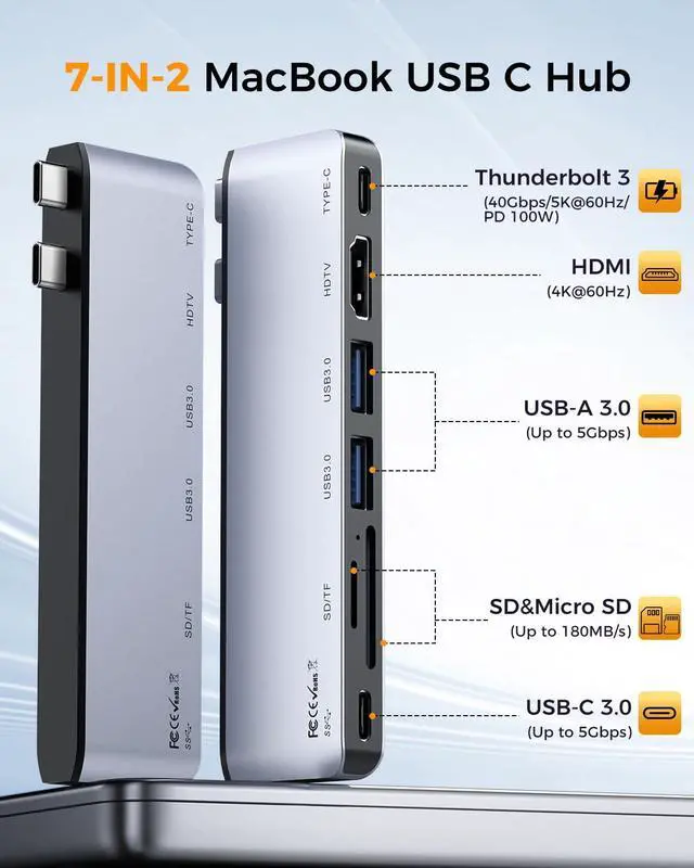 This is the core of the hub.This powerful Thunderbolt 3/USB4 port is a triple threat: it delivers blazing 40Gbps data transfer for huge files, supports up to 100W PD charging, and can drive an external display at a stunning 5K@60Hz resolution. As the core of this MacBook adapter multiport, its designed to handle demanding tasks while powering your laptop.