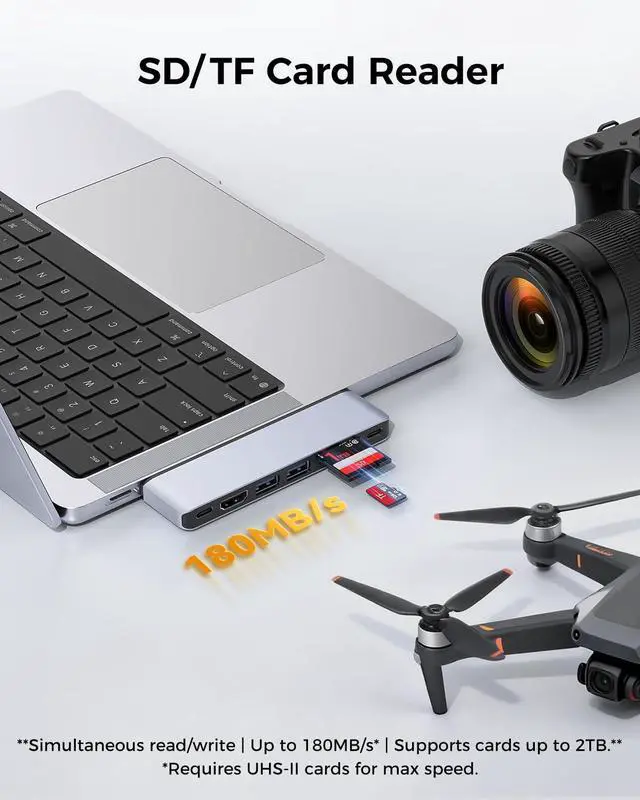 Boost your workflow efficiency. Transfer projects, backups, and media libraries in seconds via the high-speed USB ports. For photographers and creators, the independent SD/TF card readers are a game-changer, offering pro-level 180MB/s transfer speeds to offload gigabytes of high-res photos and 4K footage directly to your MacBook Air or Pro without frustrating waits.