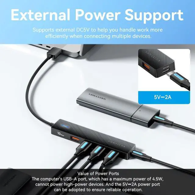 VENTION USB 3.2 Hub, transforming one USB port into four high-speed USB 3.2 ports for seamless connectivity. Experience lightning-fast data transfers at up to 10Gbps, ideal for moving large files with stability and efficiency. With a stable USB-C power supply and wide compatibility across Windows, Mac OS, and Android systems, this hub is perfect for streamlining connections to USB devices. Enjoy the convenience of plug-and-play functionality and exceptional customer service for any inquiries or support needs.