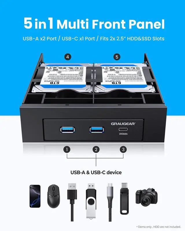 Transform your desktop with the GRAUGEAR 5.25” Multi Front Panel. Featuring high-speed USB-C and USB-A ports plus dual 2.5” SSD/HDD slots, this upgrade-ready hub brings modern connectivity to legacy PC bays. Designed for users who demand both performance and convenience.