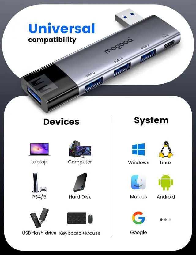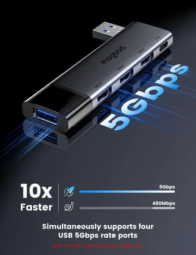 The MOGOOD USB Hub expands one USB port into 4x USB 3.0 ports and 1 Type C Power port(5V/2A), effectively addressing the issue of limited device connection options.