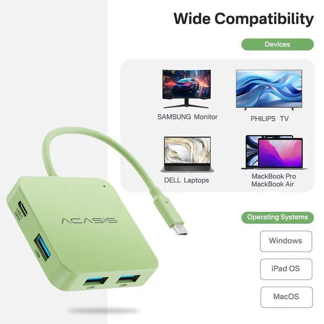 ACASIS 6 IN 1 10Gbps Type C to HDMI AdapterWith 4K 60Hz HDMI, 3 USB A 3.1, 1 USB C 3.1, and PD 100W USB C charging port, this usb c adapter supports data transfer, display expansion, charging, basically meet different ports needs. Notemake sure your computer type c port can support video transmission( USB 4.0/Thouderbolt 3/Thouderbolt 3 can support)