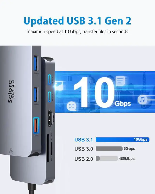 USB C Adapters for MacBook Pro/Air, Selore 9 in 1 USB C Hub with 4K HDMI, 2 * 10Gbps USB-C 3.1 GEN2 Port, 1Gbps Ethernet, USB 3.1 10Gbps Data Ports, 2*USB 3.0 dongle for Dell, HP and More