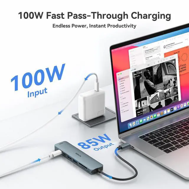USB C Data & 100W PD: Mac HDMI Adapter comes with 2*USB C port which easily fulfills your multiple needs, the USB C data port enables you to connect multiple USB C devices to your devices and quickly transfer files, such as hard drives, flash drives, mice, etc. Another PD port supports 100W power in; Power out (charging) is limited to 87W for safety, continuously charging your laptop while using