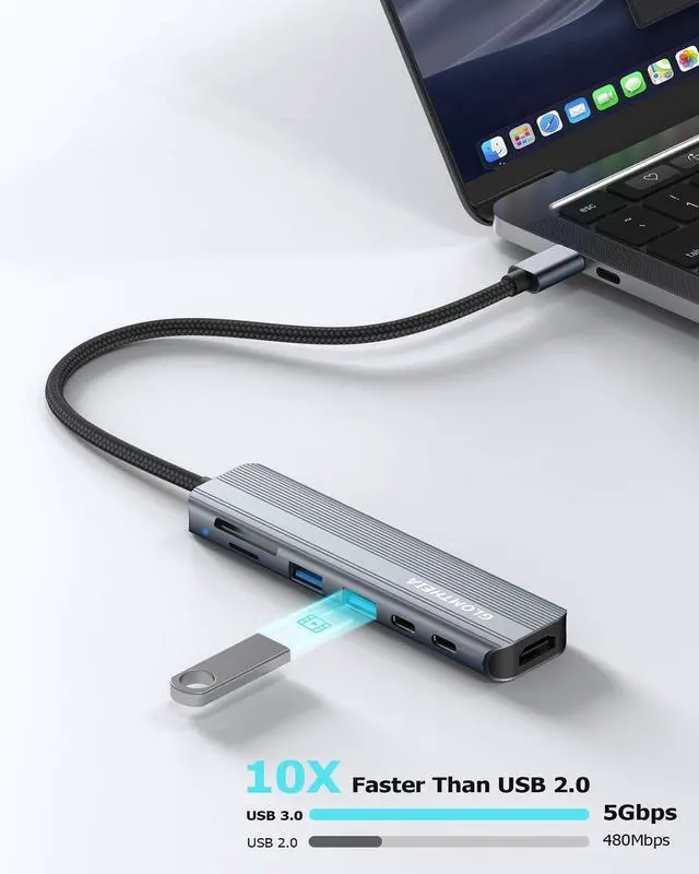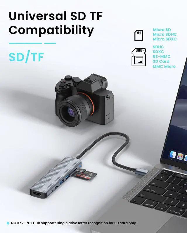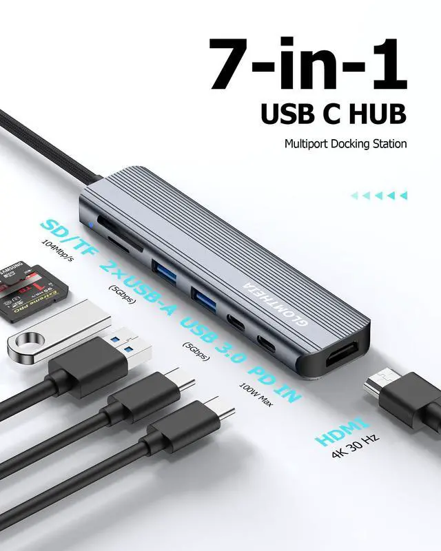 7-in-1 USB C Hub for Ultimate Productivity Expand your laptop's connectivity with this versatile USB hub, featuring Mini HDMI 4K, 100W PD charging, 2xUSB-A 3.0 ports, a USB-C data port, and SD/TF card readersall in one sleek adapter.