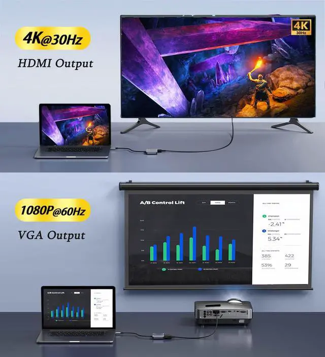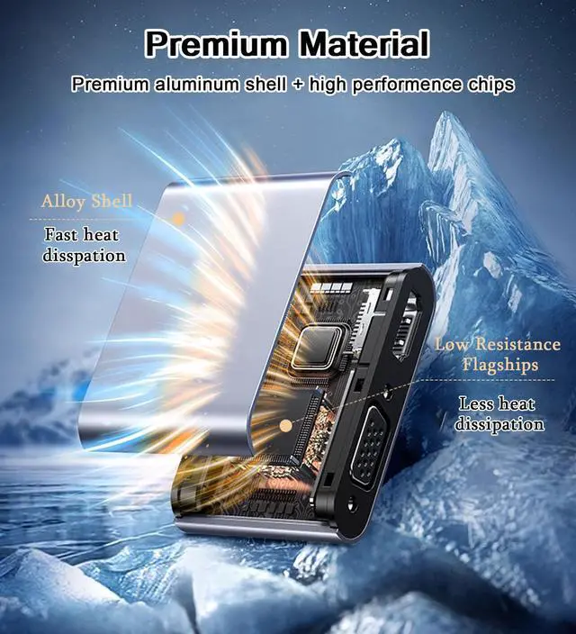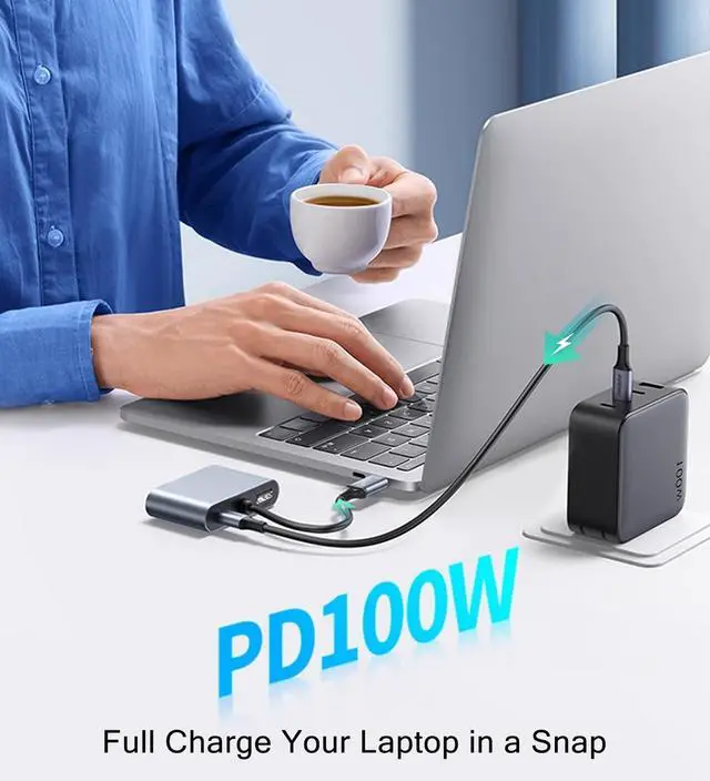 4 IN 1 Multifunction: Equiped with a 4K HDMI, a 1080P VGA, a 5Gbps USB 3.0 data port and a PD 100W usb c charging port. Supports all ports work simultaneously.